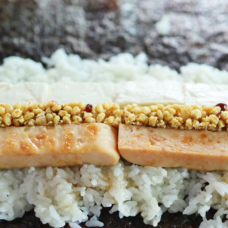 4. 김 위에 밥을 얇게 펼친 후 견과바와 크림치즈, 햄, 당근라페를 올려줍니다.
