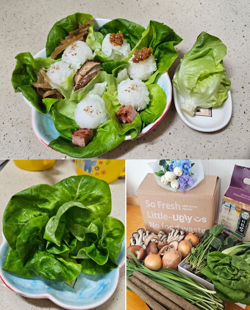 어글리어스 박스에 담겨 있던 유러피언상추를 한장한잔 뜯어 흐르는 물에 씻고 동글동글 먹기 좋게 주먹밥을 만들어 올린 후 아이가 좋아한 반찬. 좋아하지 않는 반찬. 서너가지 올려서 내어주었더니 고사리 손으로 1개 남기고 숑숑 집어 먹고 나갔는데