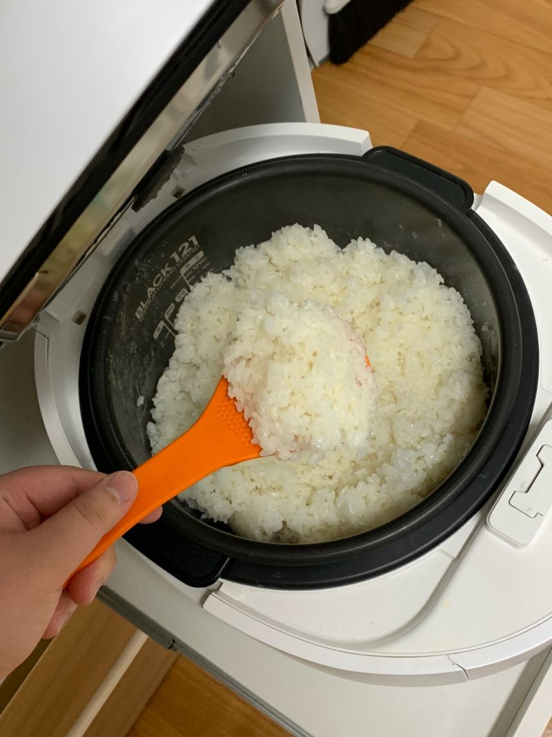밥이 완성된 다음 저어주지 않으면 밥알이 눌리고 딱딱해질 수 있어요.