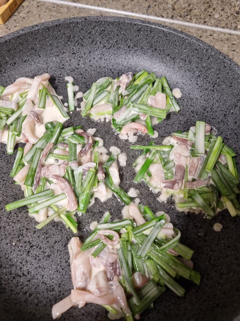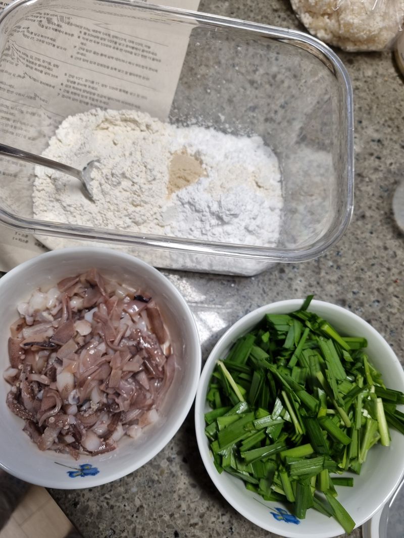 친환경 부추과 오징어로 부추전을 만들어요.