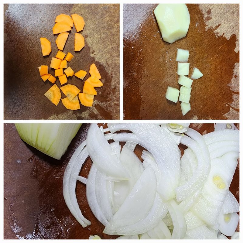 야채 썰기 가이드를 통해 그동안 칼을 잘못 잡고 있었고 잘못 썰고 있었단 것도 알았어요. 잘못된 방법으로 칼질을 하다보니 늘 손목이 아팠는데 밀어썰기, 당겨썰기 방법을 활용하니 손목에 부담이 훨씬 적더라구요. 여러가지 야채로 썰기 연습하고 요리하는데 카레만한 요리가 없는 것 같아 카레 도전! 새미즈에서 알려준 카레팁으로 물과 야채 1:1을 맞추려고 했는데, 또 깜빡해버렸네요.