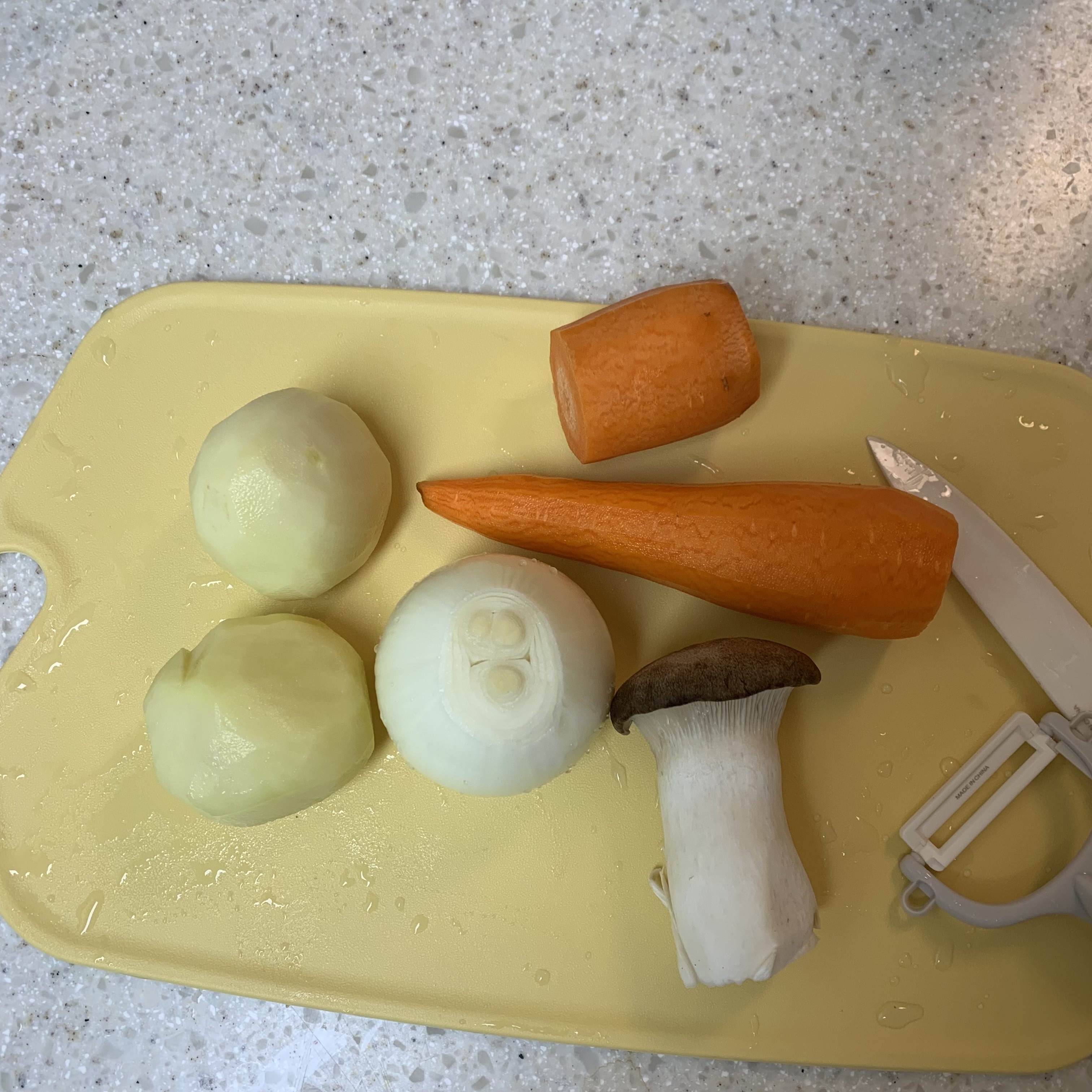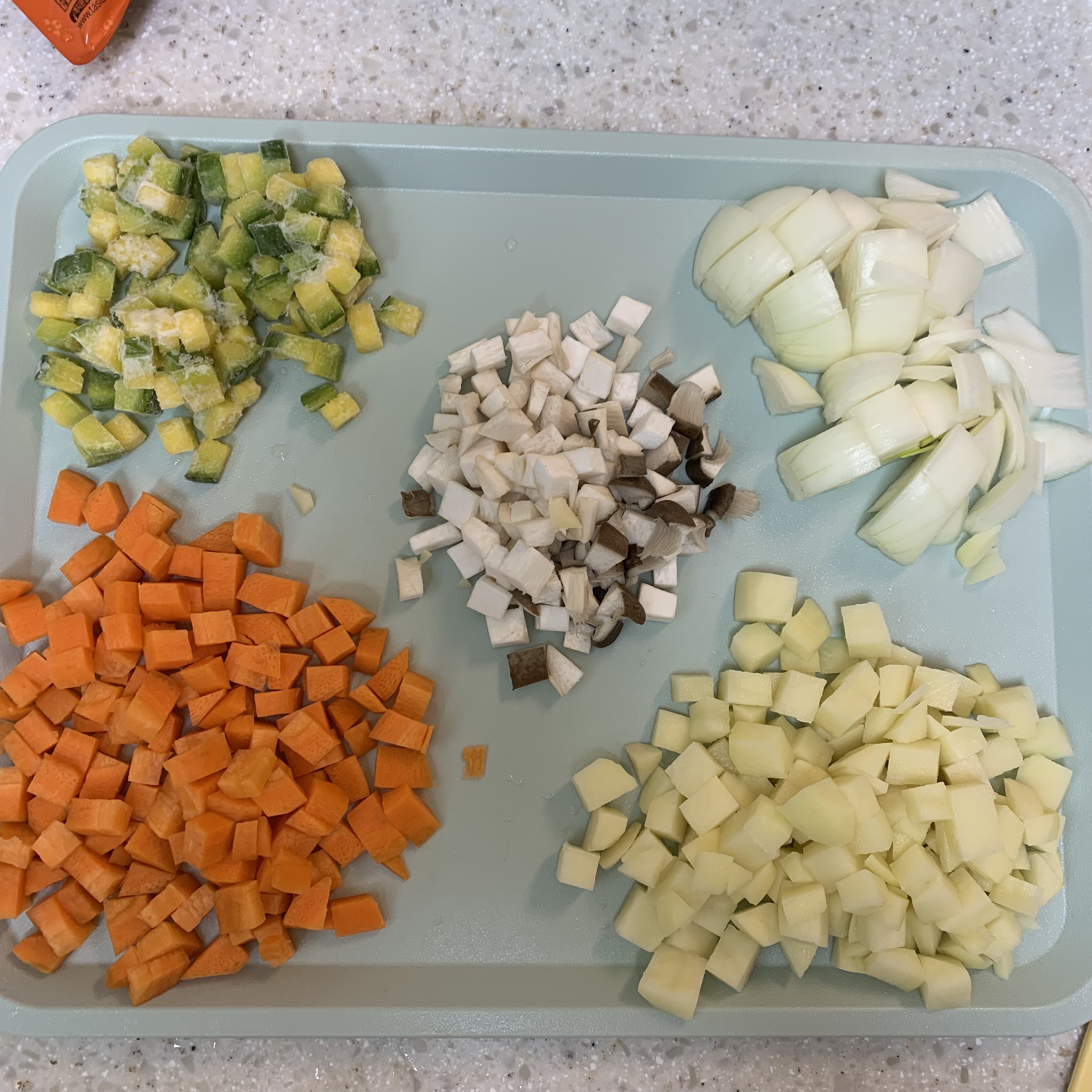 재료들은 솔루션에서 배운대로 카레 고기 크기에 맞춰서 조금 작게 깍둑썰기 했어요