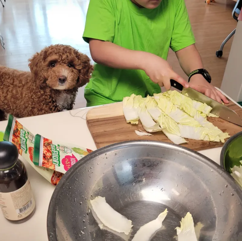 ㅎㅎㅎ큰 칼질도 잘하네요~ 강아지도 아이가 만든 겉절이가 궁금했나봐요!