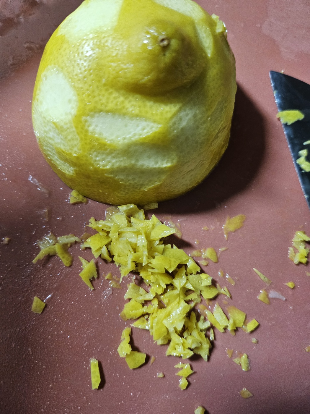 레몬껍질 손질과정에서 그라인더가 없어서 칼로 얇게 레몬 껍질을 벗겨서 잘라주었어요.