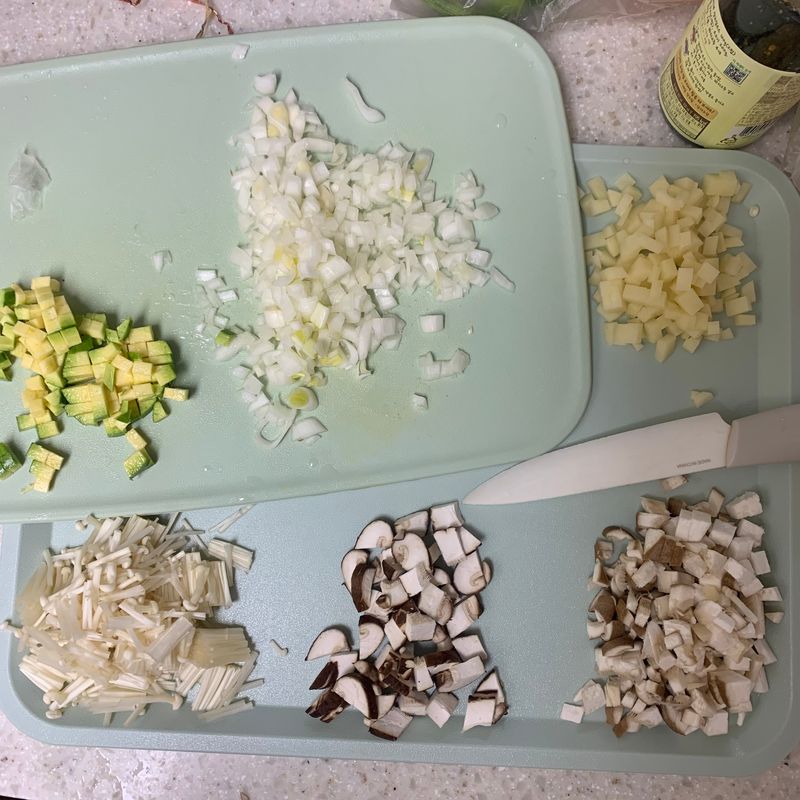 역시나 요리 과정은 엄청 간단해요~ 우선 넣을 재료들을 적당한 크기로 썰어줍니다. 새미즈 버섯강된장 레시피에는 버섯 외에 다른 재료는 없었지만 저희 집에 감자랑 애호박이 있어서 같이 넣으면 맛있겠지..? 하면서 넣어줬어요ㅎㅎㅎ 버섯은 레시피처럼 새송이, 표고, 팽이 준비했습니다ㅎㅎㅎ오일을 두른 팬에 양파부터 볶다가 감자 애호박 같이 볶고 그뒤에 버섯들 투하~