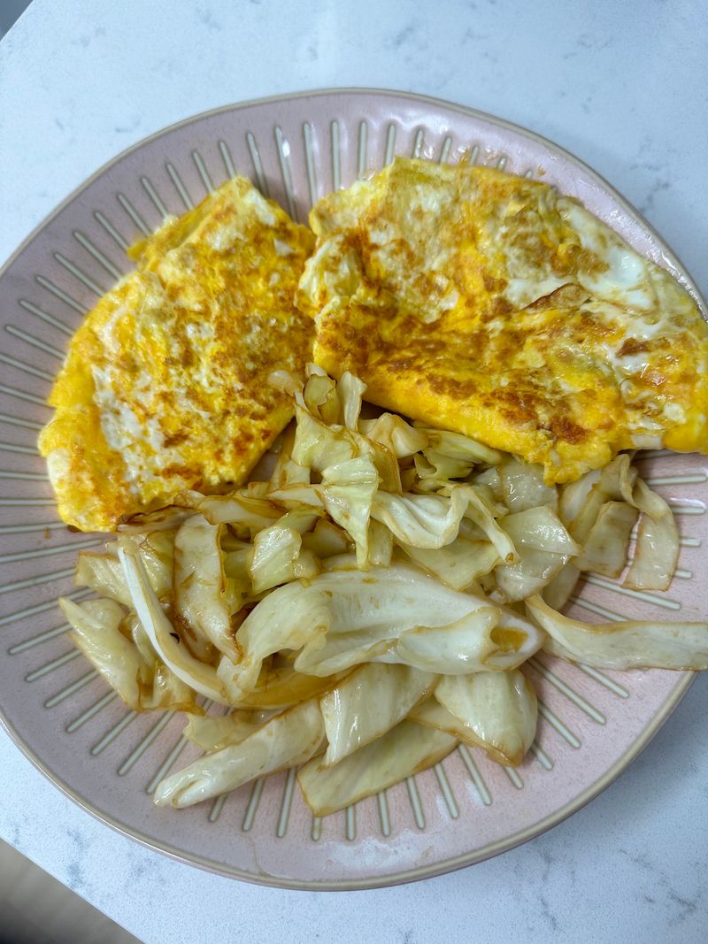양배추 연두넣고 볶아서 잔뜩 먹고 단백질 채워주려고 치즈 계란말이를 했습니다😘