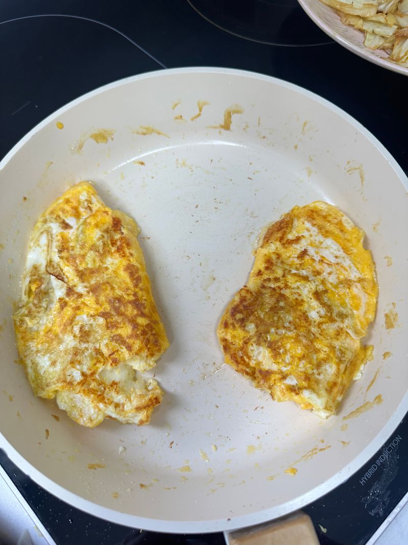근데 또 망해서 ㅋㅋㅋ 언젠가 토순맘님의 오믈렛 팁에서 영감을 받아서 약불에 동글동글 말아만 줬는데 모양이 예뻐진 것 같아서 행복했어요 🤣