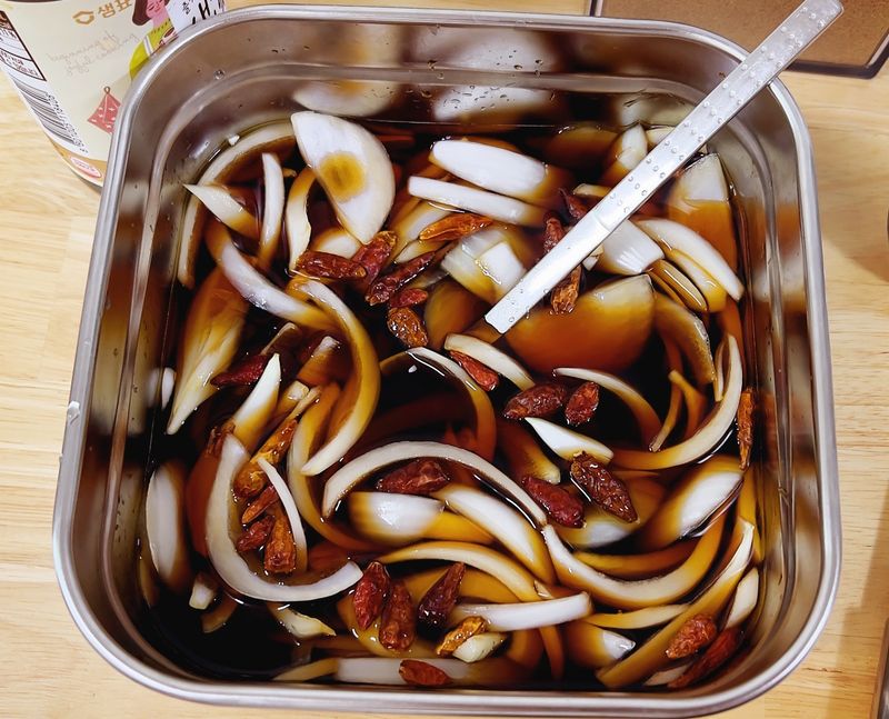 양파는 다지지 않고 장으로 먹기 위해 길게 길게 썰었습니다.