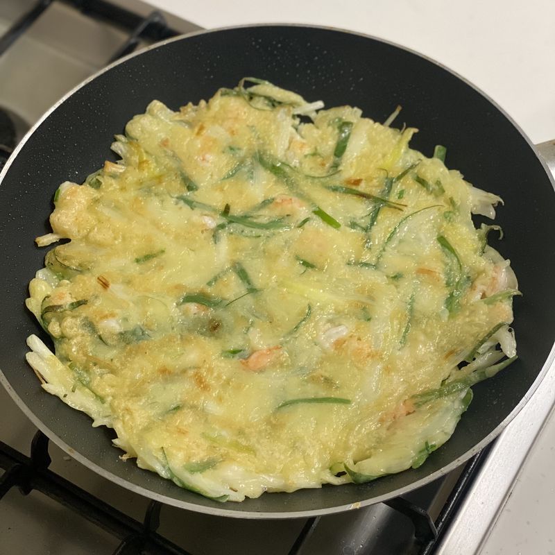 오징어가 없어서 냉동실에 있던 새우를 작게 잘라 같이 반죽에 넣었구요.