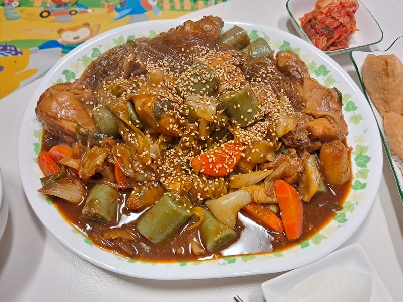 각종 야채를 넣어주고 닭이 익었을 때 불린 당면과 가래떡을 넣어 줍니다.