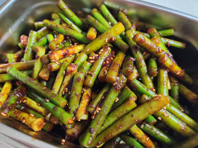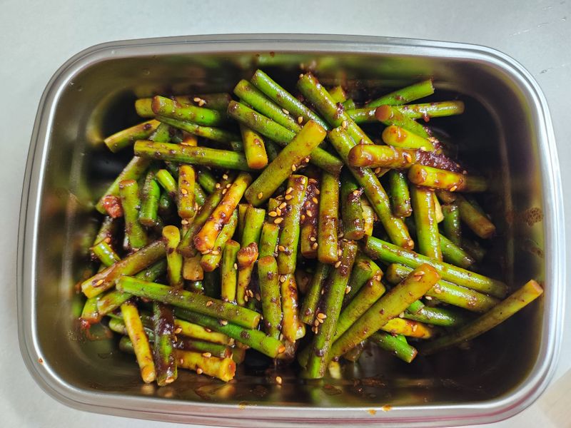 마늘쫑이 요즘 많이 나오는 철이네요. 마늘쫑을 끓는물에 살짝 데치면 알싸한 맛도 사라지고 아삭한 식감도 업이 된다고 하네요. 고추장 양념으로 무치니 매콤 달콤해서 자꾸 손이 가네요.