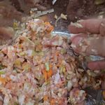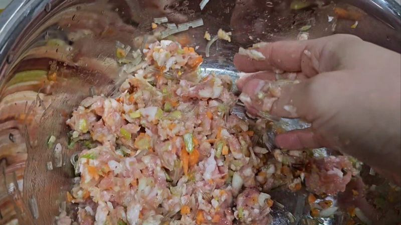 간 돼지고기 등심과 다진 야채를 섞어 준다. 양념은 후추와 소금 간으로 한다.