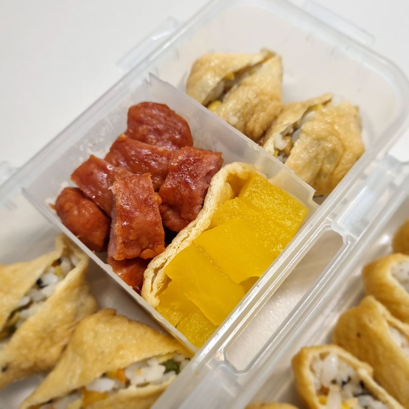 아이 도시락을 처음 싸보았습니다. 요리가 서툴러서 sns에서 보는 멋진 도시락은 못됩니다. 병아리콩밥에 밥친구섞어 새콤소스 비벼서 유부로 감쌌습니다. 반찬은 단무지와 소세지를 작게 잘라 넣었습니다. 편의점에서 5천원 주면 훨씬 맛있고 푸짐한 도시락을 살 수 있지만 직접 만드는 동안 행복이 느껴졌습니다.
