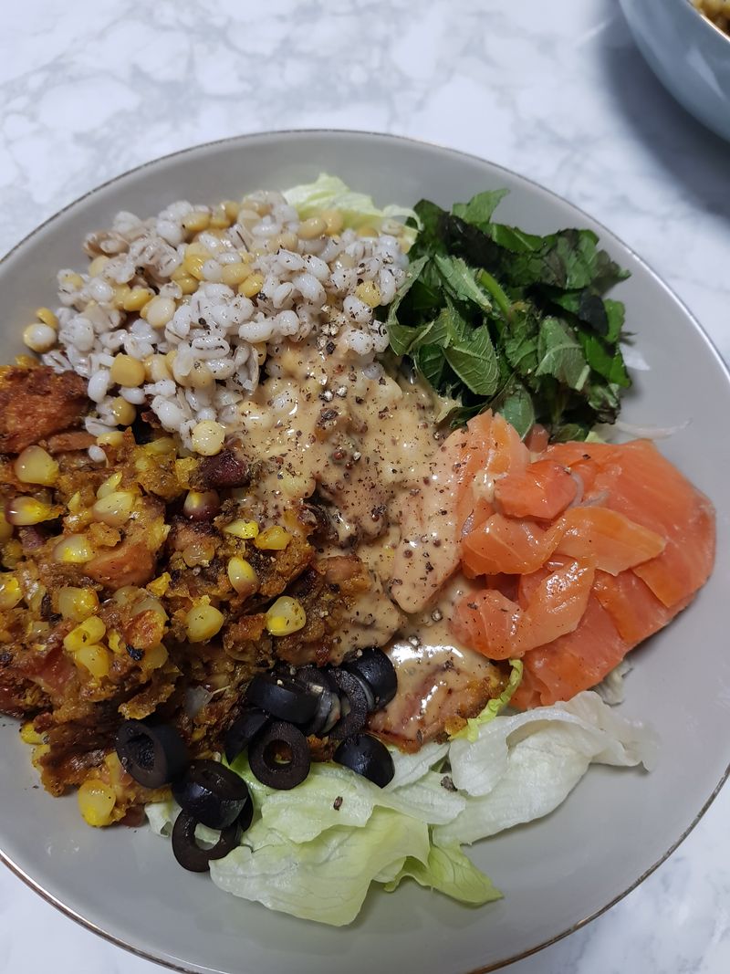 연어와 각종 곡물, 야채를 넣고 건강한 포케를 완성했습니다! 소스가 킥이에요~ 마요네즈, 스리라차, 올리고당, 약간의 후추면 완전 맛있어져요!!