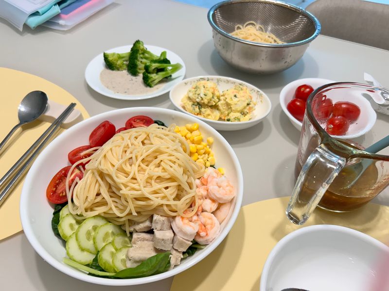 재료: 파스타면/양상추/샐러드/오이/ 닭가슴살이나 새우/방울토마토