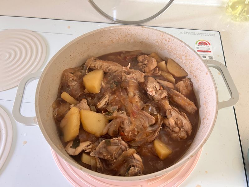 물 800ml를 넣어서 끓이고 식초 1T를 넣어줍니다. 감자를 넣고 뚜껑을 닫아 15분간 끓인 후, 뚜껑을 열고 추가 5분간 졸여줍니다. 그 후 당면을 넣어주면 끝!