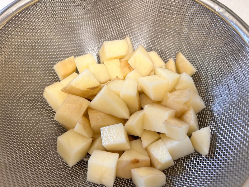 감자를 한 입 크기로 자른 후 물에 씻어서 전분기를 제거 해 줍니다