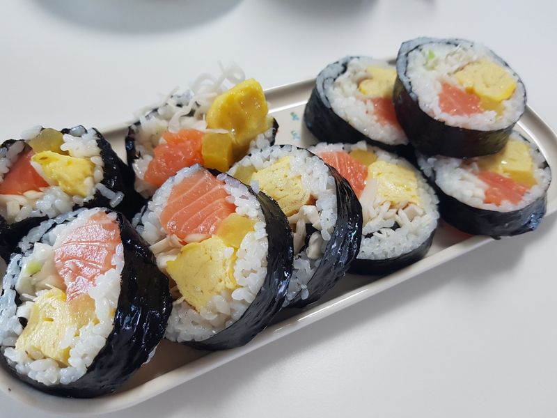 맥시멀리스트 김밥, 후토마끼 온라인으로 연어1키로를 구매했어요~ 600그램 정도는 연어 초밥 해먹고 나머지를 어찌 하나 해서 레시피에 "연어" 검색했더니 후토마끼가 나와서 해봤답니다. 레시피 그대로 했는데 전..제가 이렇게 잘 말릴줄 몰랐어요^^ 난생 처음 해보는 요리인데.. 어디 근사한 일본 식당 온 줄 알았네요. 자주 해먹어야겠어.은근쉬워요.!!