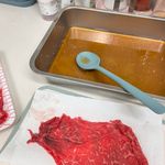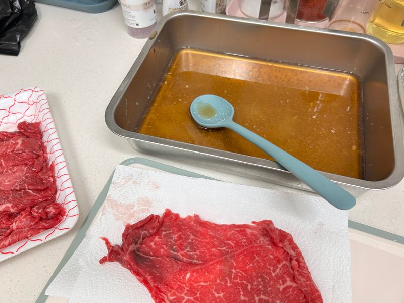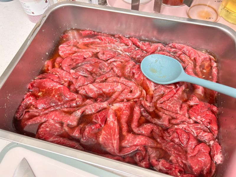불고기용 고기를 하나 하나 떼어 핏물을 제거하고 양념에 잠기게 넣어줍니다.