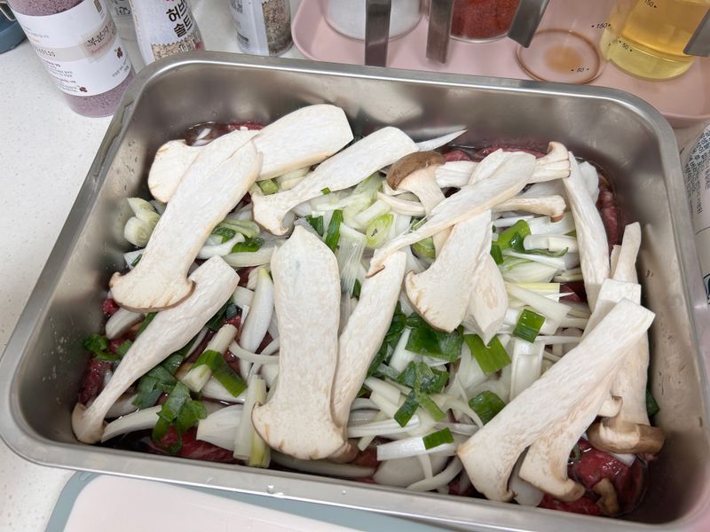 양파와 파를 채썰어 그 위에 덮어 줍니다. 버섯도 넣어줍니다.