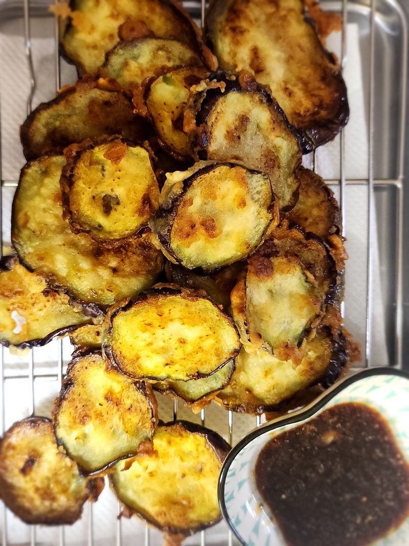 제철음식 가지로 맛있게 튀김을 했어요 같이 먹을 소스도 기름에 마늘을 볶아서 간장베이스로 새콤달콤하게 만들어서 찍어먹으니 더 맛있네요