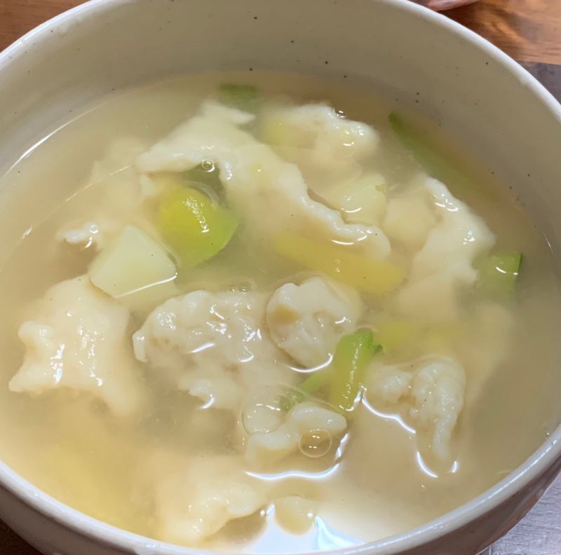 육수가 끓으면 수제비 반죽을 얇게 떠 넣고 감자와 애호박을 썰어 넣습니다