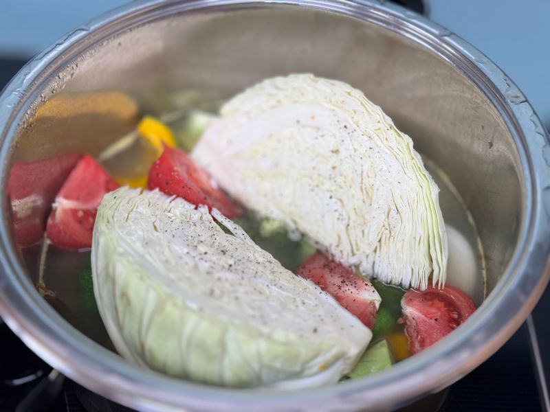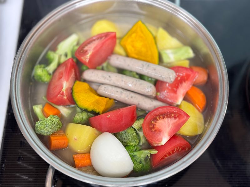 단단한 야채우선 물과 치킨스톡넣고 끓이다가 나머지야채와 소시지 넣고 끓여주면 끝입니다