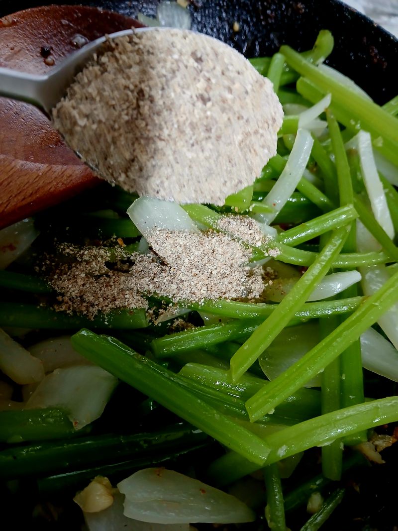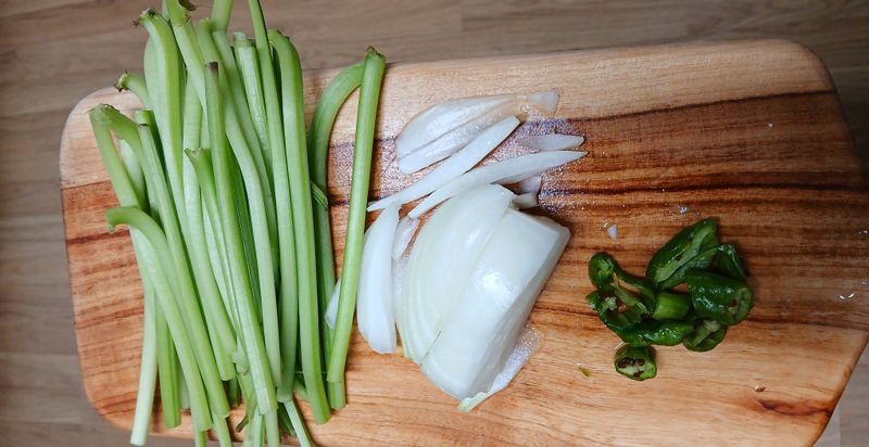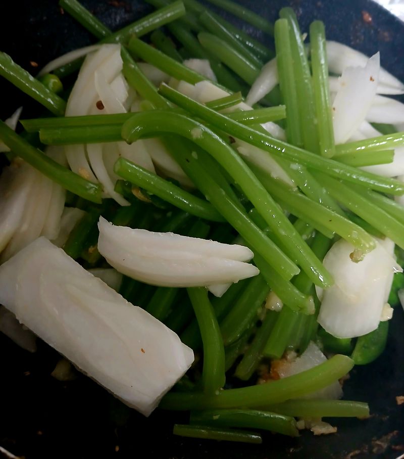 4. 기름에 마늘을 넣고 볶다가 고구마순, 양파, 고추를 넣고 볶어주세요.