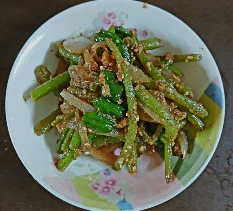재료 ㅡ고구마순, 양파, 고추약간, 기름, 마늘,소금조금, 연두, 국간장조금, 들깨가루