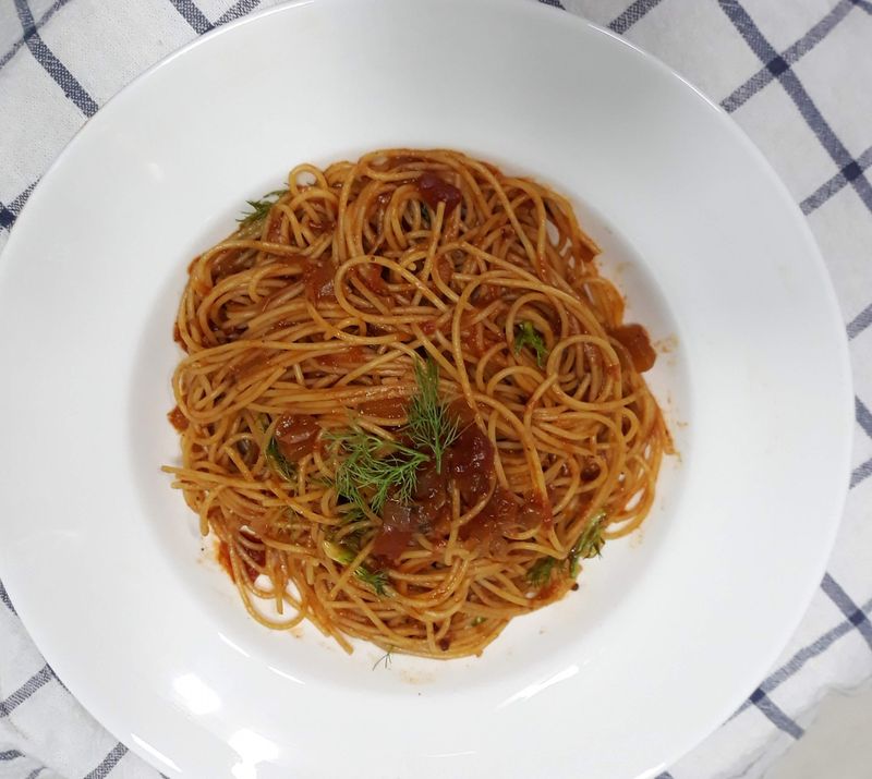 그리고 면 삶아서 휘리릭 토마토 스파게티 한 접시 만들어 먹었네요.