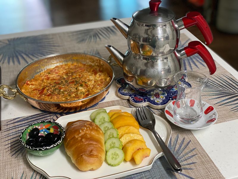 오이, 토마토 송송 썰고 메네멘, 빵, 올리브, 쨈, 카이막 꿀, 홍차가 있으면 완벽한 튀르키예식 아침식사!!