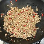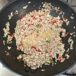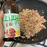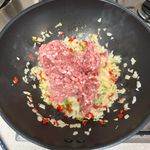 프라이팬을 적당히 달군 후 식용유를 두르고 준비해둔 다진 야채들(마늘, 양파, 홍고추, 청양고추)을 넣고 볶아줍니다. 그리고 돼지고기 다짐육도 넣어 고기가 노릇노릇해질 때 까지 튀기듯이 볶아줍니다.