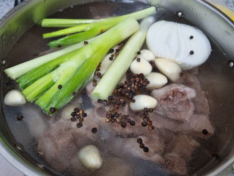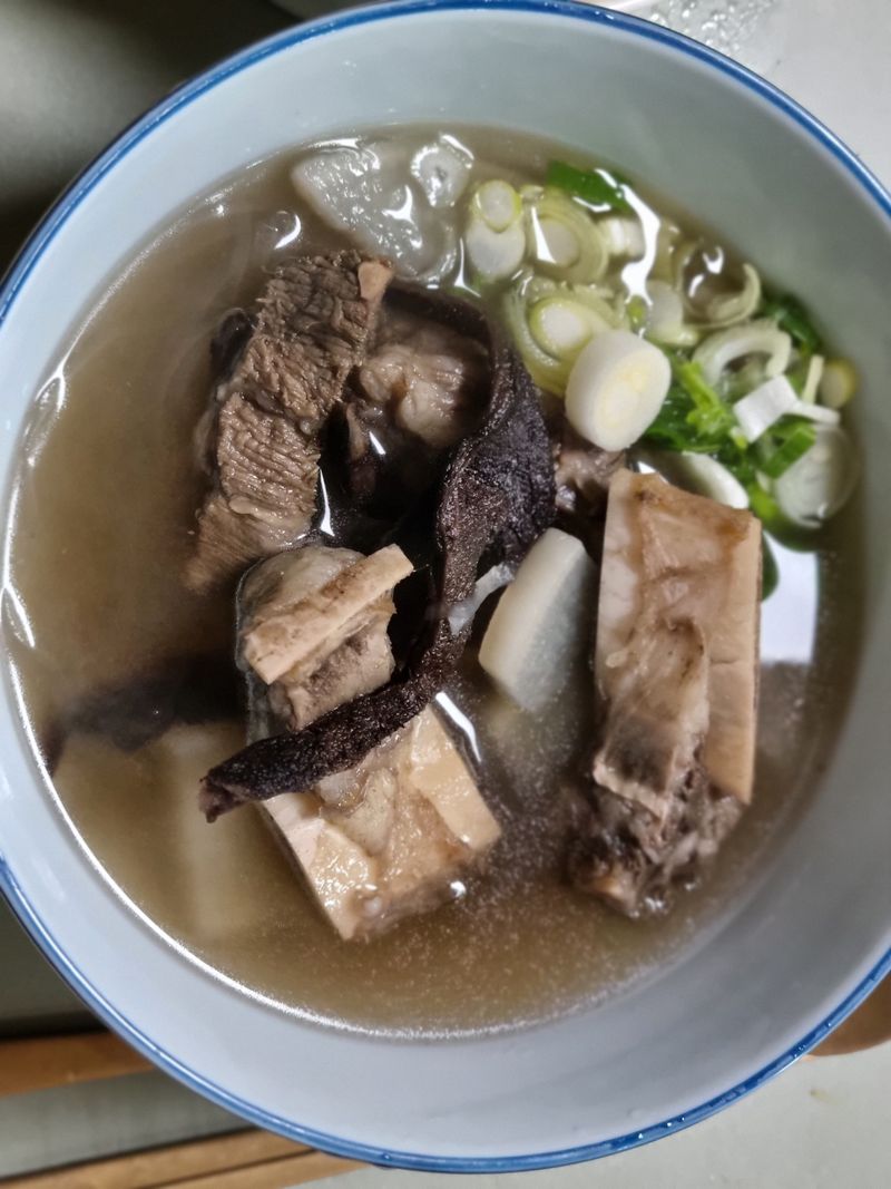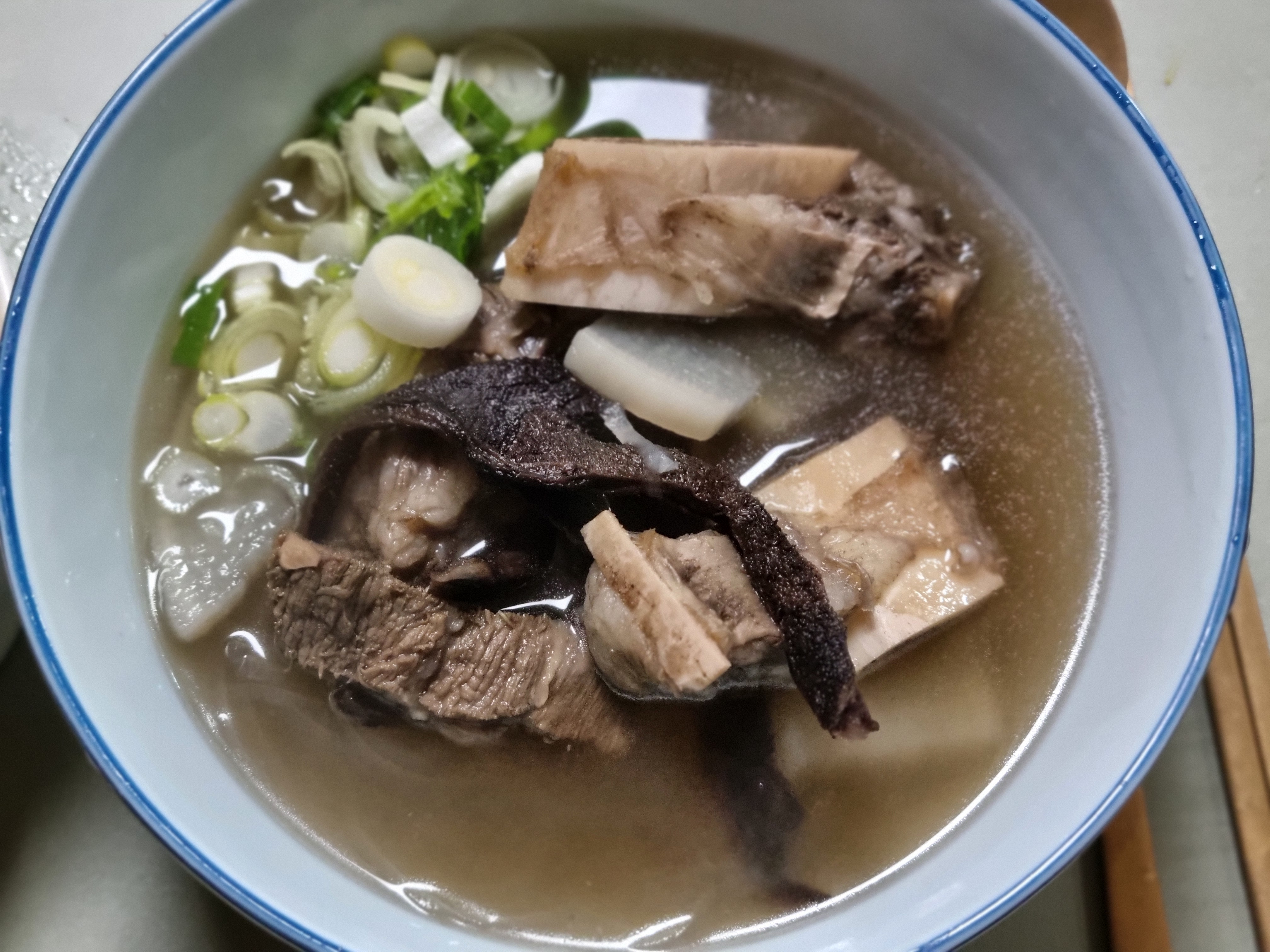 탕용갈비 1키로 핏물빼고 끓는물에데쳐 불순물 제거후 깨끗하게씻은 갈비와 대파 양파 통마늘 대추 통후추 무 넣어 끓여준뒤 고기랑 육수재료랑 빼주고 식혀 기름걷어준뒤 얇게썬무와 냉동실에 있던 능이넣어 한번더 끓여 보양식으로 한그릇