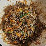 재료를 볶고 흘리고 닦고 뭉친 당면을 넣고 우여곡절끝에 잡채소스를 넣는 시간이 왔습니다.
