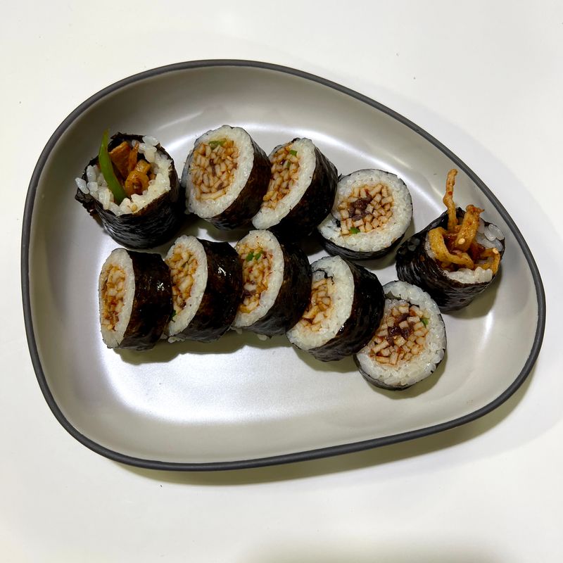 김밥용 김 대신 삼각김밥 김을 사용해서 꼬마김밥으로 만들었고 연두청양초가 없어서 연두순을 넣어서 볶아봤는데 맛있더라고요!