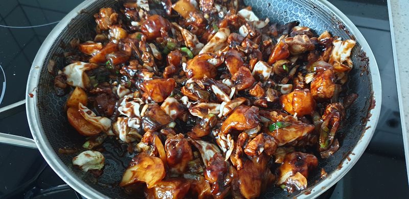 이제 대망의 차오차이 특제짜장 소스를 넣어 주고 레시피대로 5분간 더 볶아 줍니다.