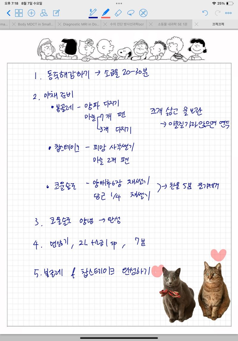 티비보면서 할아버지표 마늘 껍질을 또 열심히 깠습니다. 저번에 알려주신데로 꼭지 부분부터 잘라서 칼로 슥슥 벗겨냈어요! 그런데 점점 끈적끈적하게 달라 붙길래 물 묻혀가며 하니까 잘 떨어지더라구요~ 예전에 엄마가 마늘을 물에 담궈놓고 껍질을 까던게 이런 이유구나 이제야 알았습니다😂 그리고 야채들을 각 요리에 맞게 칼질을 했는데요, 이제는 다지기, 마늘 편썰기는 조금 자신이 붙은 느낌이었습니다~! 그치만 코울슬로를 위한 채썰기는 아직 어렵더라구요🥲 이번에도 채칼이 간절히 생각났지만, 꾹 참고 꿋꿋하게 이건 성장을 위한 과정이다! 리마인드하며 열심히 썰었습니다. 결과는 채썰기... 보다는 막대썰기에 가깝지만, 오히려 두꺼우니 씹는 식감이 좋은 코울슬로잖아! 럭키비키🍀 라고 원영적 사고를!!!