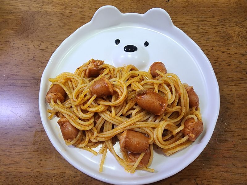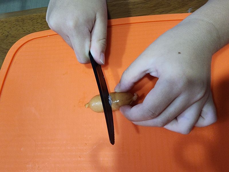 아이들이 고사리같은 손으로 비엔나소시지를 반으로 자르고