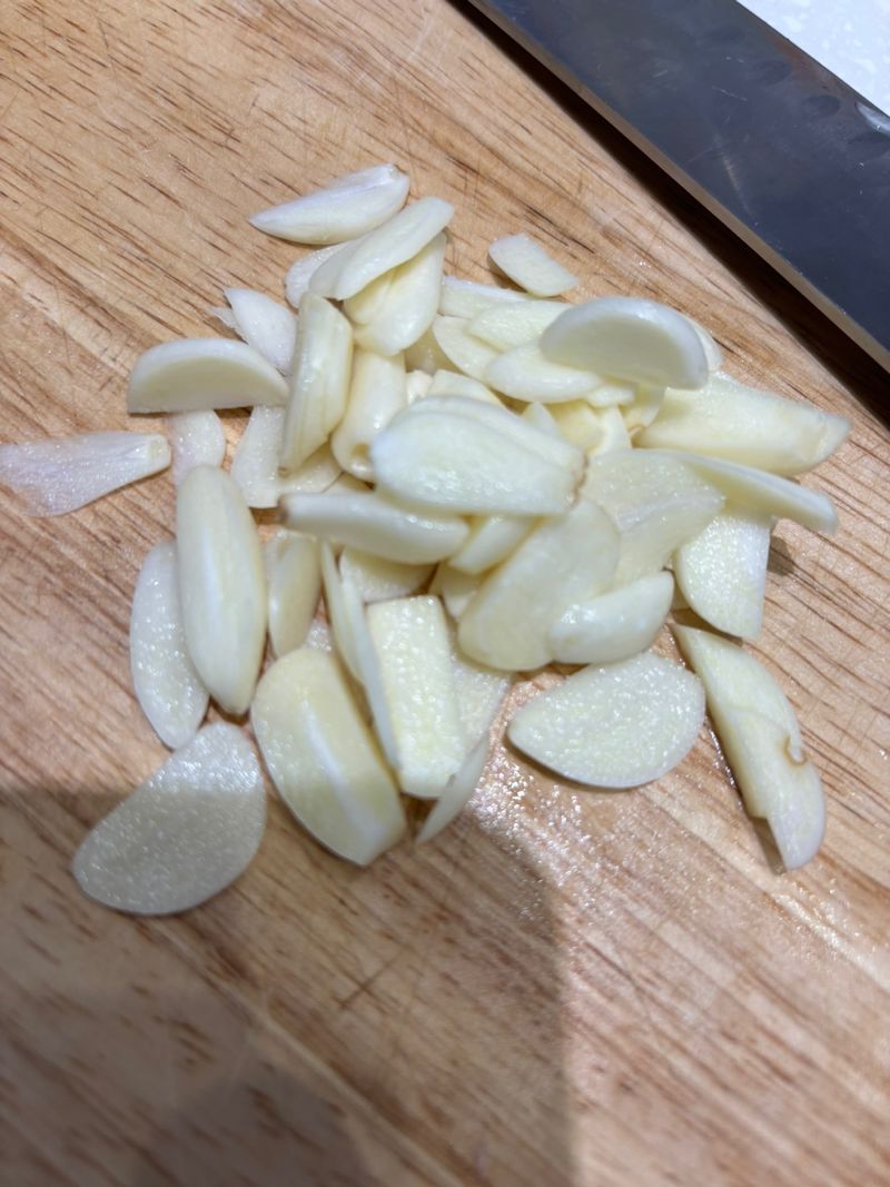 큼지막하게 썰면 되는 버섯, 베이컨 과 다르게 마늘은 크기가 작아, 초보자는 썰기가 어려운 편이에요.
