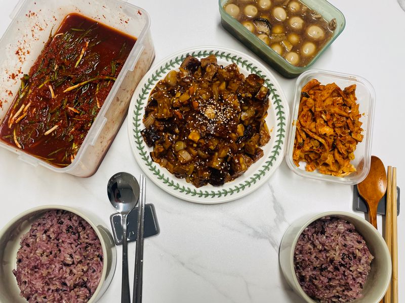 밥 차리려 냉장고 반찬 꺼내고 보니, 새미네 양념으로 만든 파김치, 새미네 양념으로 만든 메추리알 장조림, 새미 레시피로 만든 어묵볶음까지 새미네표 밥상이 되었더라구요 ㅋㅋㅋ