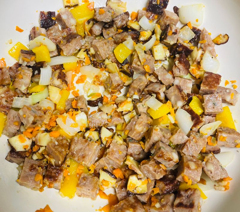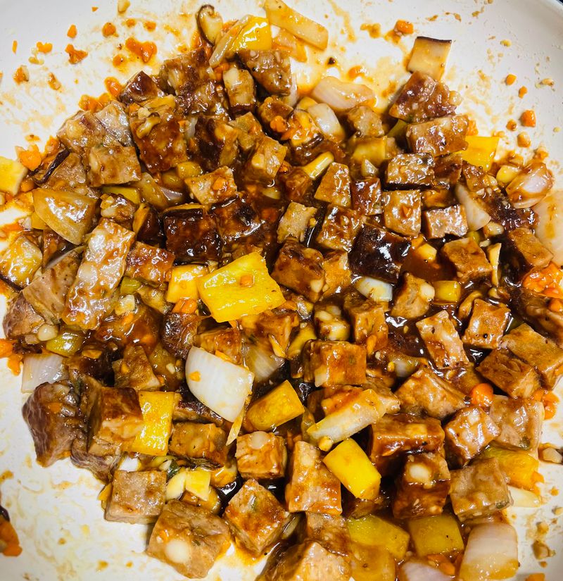 그러곤 손질 해둔 야채 볶고, 다 볶은 후에는 떡갈비 다시 넣어 후루룩 섞어준 뒤 소스를 넣었어요! 소스를 넣기 전 살짝 맛보니 개인적으론 새콤한 맛이 좀 있어서 새콤함을 살짝 그려줄 설탕 반숟갈 넣고, 매콤한 맛 있었으면 해서 무턱대고 고추장을 반숟갈 넣고 섞었습니다 ㅎㅎㅎ