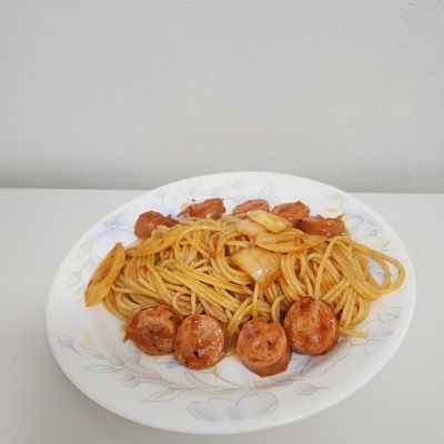 재료는 마늘 3개, 간마늘, 청양고추, 올리브유, 양파로 만들었는데, 방울토마토와 소시지, 베이컨 등을 함께 넣으면 더 풍부한 오일파스타가 될 것 같아요.