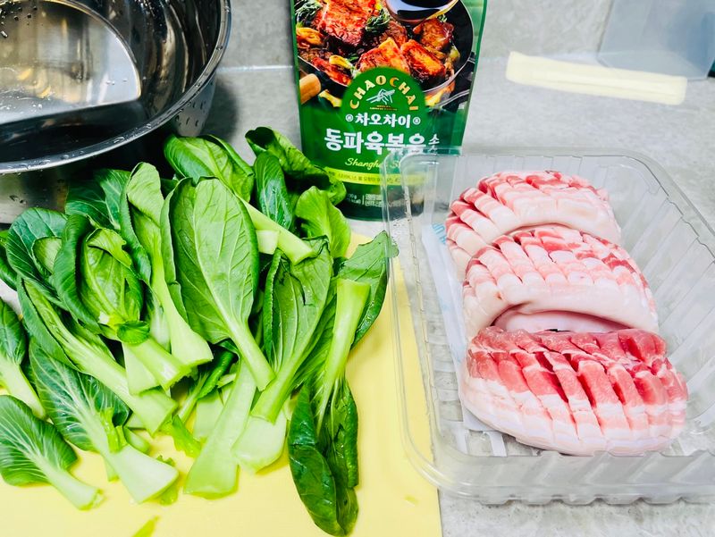 원래는 마파두부만 하려고 했는데, 마트에서 만난 이웃이 우리 집에 놀러온다는 말에 '동파육도 도전해볼까?' 하는 생각에 삼겹살과 청경채를 사왔습니다 ㅎㅎㅎ 단순한 이유로 마라는 안 좋아하고, 동파육도 재료가 간단해서 도전해보기 좋을 것 같더라구요!