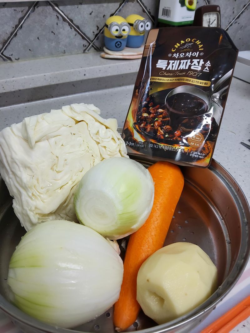 양파.양배추,당근.감자를 볶다가 특제짜장소스넿고