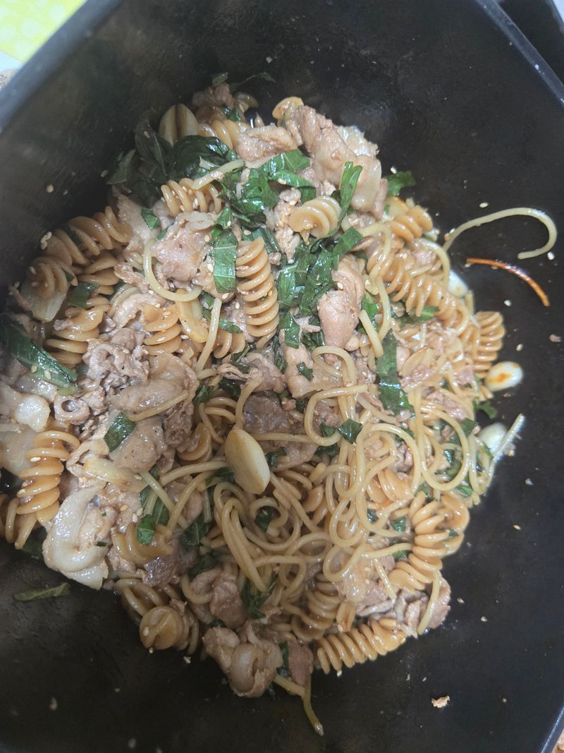간장2.굴소스2.설탕1.후추.마늘.소금.깻잎. 오린엔탈소스1.대패삼겹살.폰타나파스타면.집에있던푸실리파스타면 으로 만든 즐요클럽) 양식- 대패삼겹살불고기파스타 만들었어요!!!