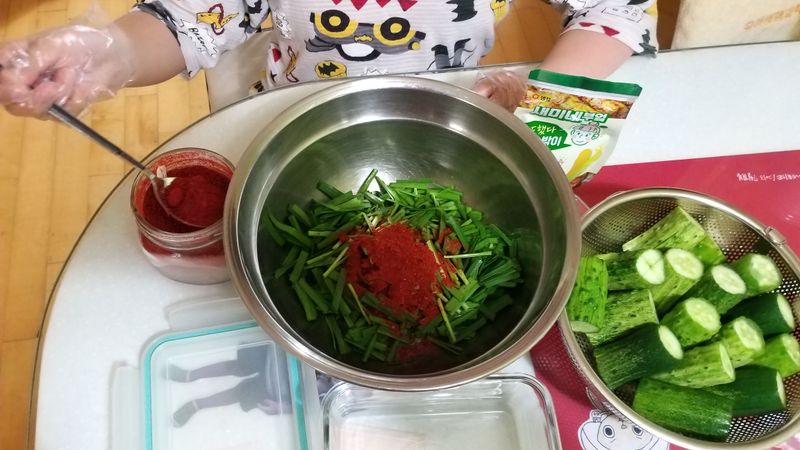 부추를 자르고 고추가루 7숟가락정도 넣고 새미네부엌 양념을 넣어 섞어주면 양념이 완성!!!