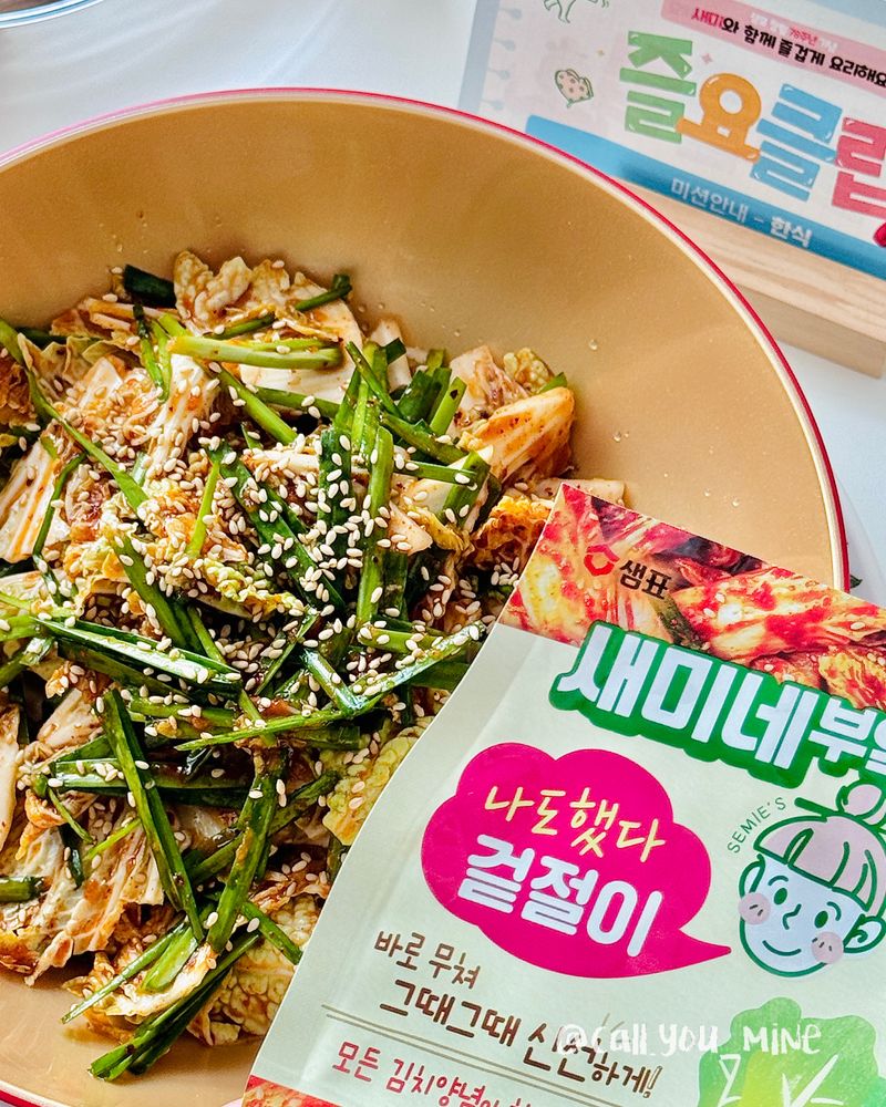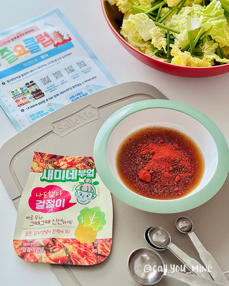 소스에 고춧가루를 넣고 섞어준 뒤 알배추+부추와 함께 버무리면 끝!!!