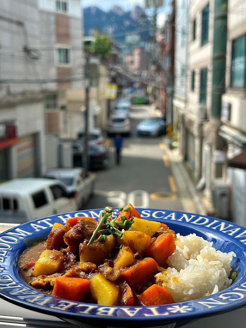 카레는 당근과 감자만 넣은 상태로 소스와 같이 끓인 다음에 밥 위에 바로 올려주면 완성!