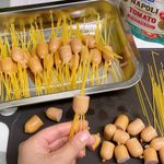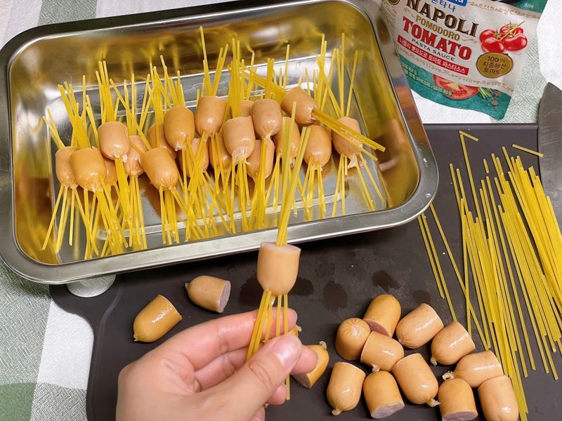 비엔나 소시지를 반으로 잘라 반으로 자른 스파게티면을 꽂아 줍니다