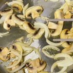 익힌 야채와 버섯이 있는 팬에 파스타소스를 넣어 주고, 파스타를 건져내어 함께 잘 섞이도록 볶아 줍니다